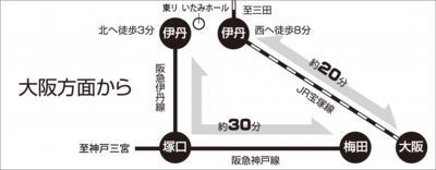 -JR大阪駅(福知山/宝塚線)-(普通列車約20分)-JR伊丹駅下車(快速も停車します)