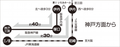 阪急神戸三宮駅(神戸線)-(約35分)-阪急塚口駅(伊丹線)-(約10分)-阪急伊丹駅下車