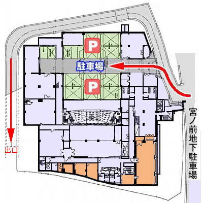 午後11時~翌日午前7時の出入口は南側(みやのまち3・4号館地下駐車場)のみになりますので、