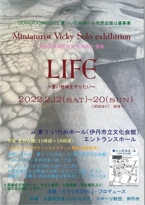 特に、東リ いたみホールの天井高いエントランスロビーで、実存したアフリカ象やキリンを高さ3.6mの等身大で描いた作品展示は、生命のダイナミズムを直に体感できる大作。他、生き物の共生を描いた作品群も必見です。