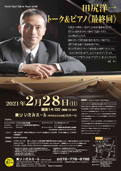 『田尻洋一の伊丹トーク&ピアノ』は今回で最終回を迎えます。皆さまには20年余にわたって温かなご支援をいただき、心より御礼申し上げます。