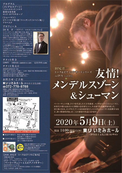 2020年5月9日(土)14:00開演を予定していました「田尻洋一トーク&ピアノコンサートシリーズin伊丹vol.85 友情!メンデルスゾーン&シューマン」の開催を中止します。(振替公演はございません。)