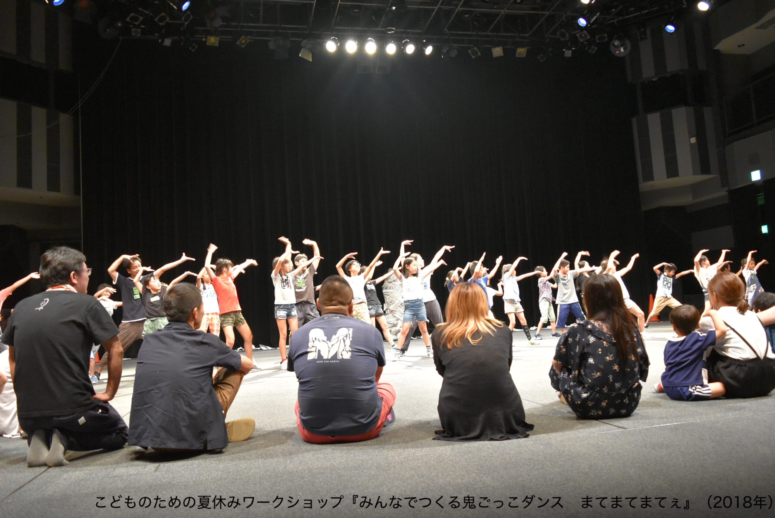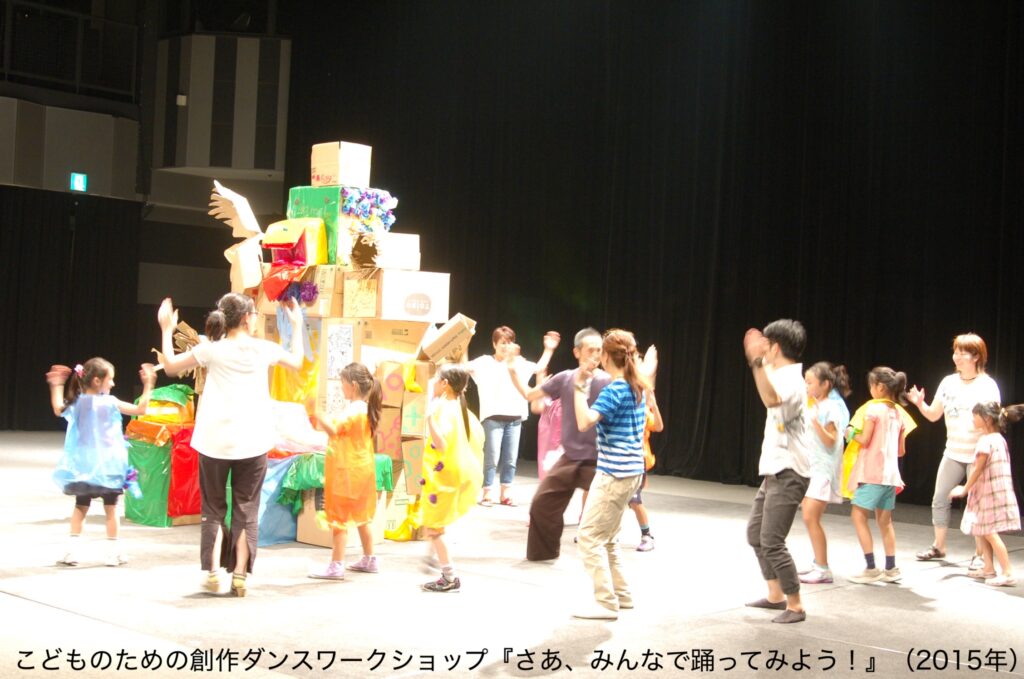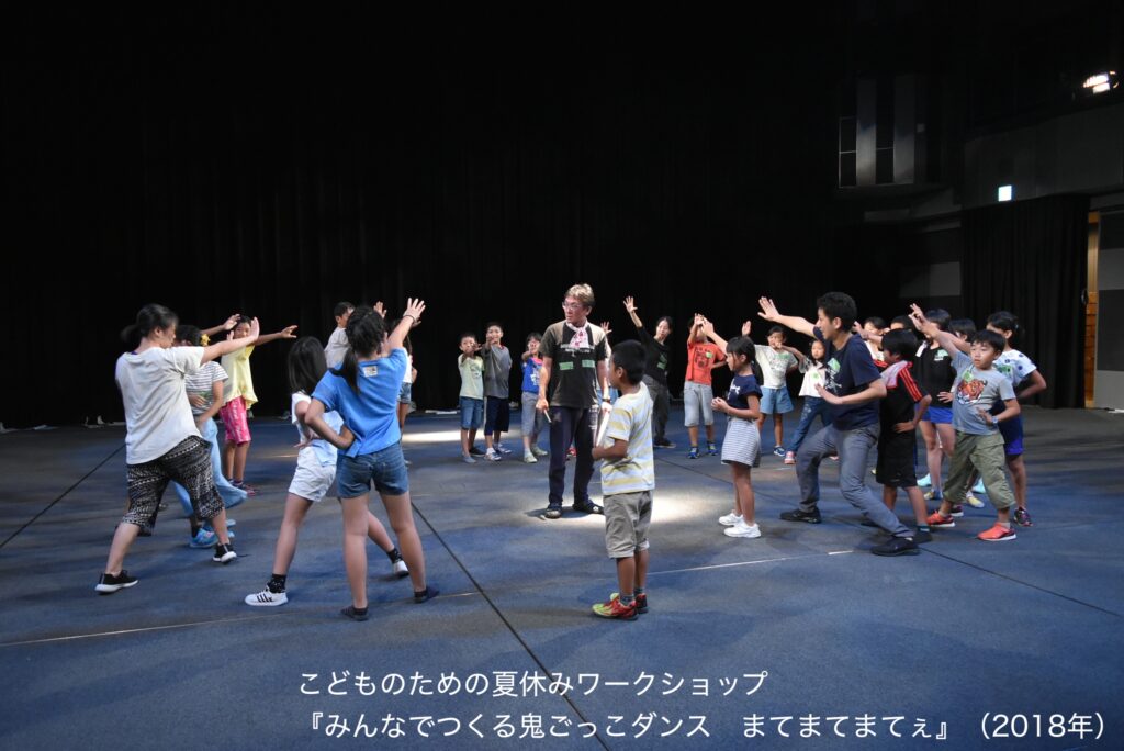 2010年から始まった「子どものためのダンスワークショップ」は、その後、担当が香井亜希子さんに代わり、コロナ禍を経た2021年まで関わらせていただいた。このワークショップは、一般的なダンス教室のように講師が考えた振付を子どもたちに一方的に指導するというものではなく、子どもたち自身が身体を通して何かを発見し、創造していく場だった。初年度の2010年にはcontact Gonzoの塚原悠也さんと講師を共にし、投石器を作ったり、平台を組み立てて会場全体をジャングルのようにしたりしながら、子どもたちがまるで野生児に戻るかのようにダンスを生み出していった。また、2014年から音楽家のぶつぐさんにアシスタントとして関わってもらうようになり、その時は、伊丹を題材にした詩を子どもたちと考え、その詩をもとにぶつぐさんに作曲してもらい、それに合わせてダンスを作った。そして2017年からは「怪談ダンス」「鬼ごっこダンス」「おねだりダンス」など、演劇とダンスをミックスした仕掛けを、劇作家・演出家の林慎一郎さんとあれこれ考えながら子どもたちと一緒に作り上げていった。