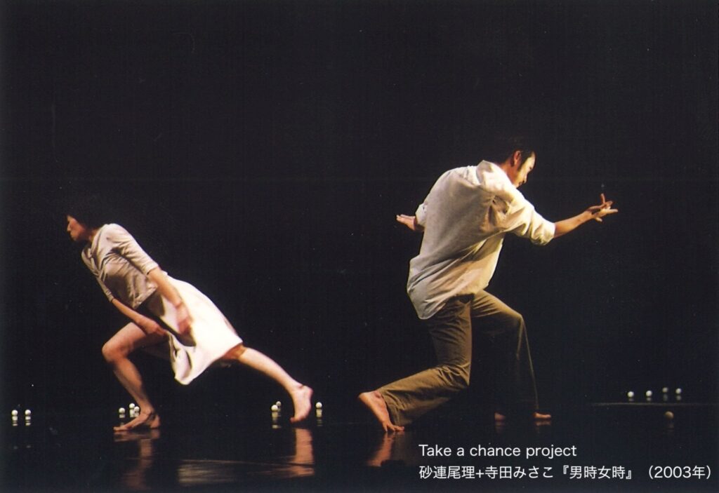 当時、ダンス企画をプロデュースされていたのは志賀玲子さんで、無音で1時間の即興ダンスを企画するなど、志賀さんが手がけるものはどれも尖っていて刺激的だった。そんな志賀さんから、「Take a chance project」という新しいダンスプロジェクトへの参加を打診されたのが、確か2001年頃だったと思う。これは「一か八かやってみる」という意味を込めた、振付家や演出家を1年に1作、計3作にわたって継続的に支援するプロジェクトで、「砂連尾理+寺田みさこ」として参加しませんかと声をかけていただいた。
