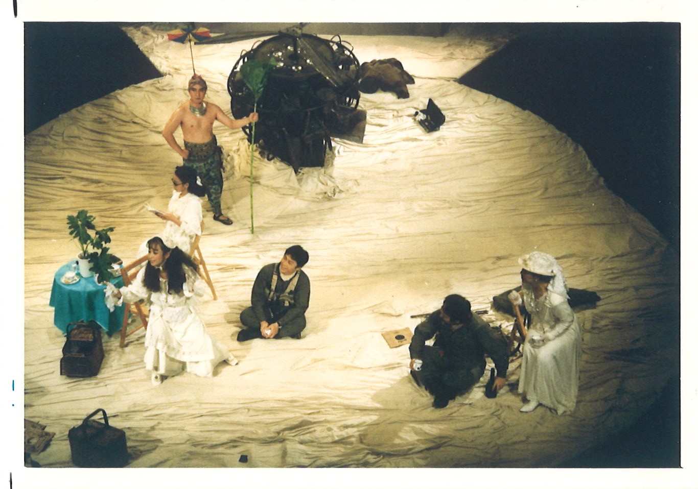 ところが、余程日頃の行いに問題のある人物がいるのか、本番前に台風の直撃を受けることになった。「だいじょうぶやで」という遊戯祭のスタッフも顔がひきつっている。会場は維新派が丸太とシートで作った特設会場、通称“タンク”。風が吹き出した。タンクを覆っているシートを外さなければタンクが倒れる。そして大雨。ついに水は会場へ流れ込み、約20cmの浸水。とにかく全員で水すくい。北村想、佳梯かこも腰下まで水に浸かって作業を行う。この時、リーダーシップを取り、作業を的確に進めたのが金守珍。さすがにテント出身者と皆、変な感心をしていた。本当に芝居はできるだろうか。そして幕が上がった。客が入り、照明が入ると、作品は何とか出来上がっていた。プロの役者の踏ん張りに感激した。その後、東京公演を済ませ、伊丹に戻り、全公演を終了した。打ち上げは想さんや佳梯かこさんも参加して頂き夜明けまで続いた。初めてのプロデュース公演。ホールが自らを表現することの重要な意味をとにかく成立させることができたのは、何よりアイホールスタッフの力である。近藤さん、稲澤さんをはじめとした伊丹市の職員の頑張りであったと思う。