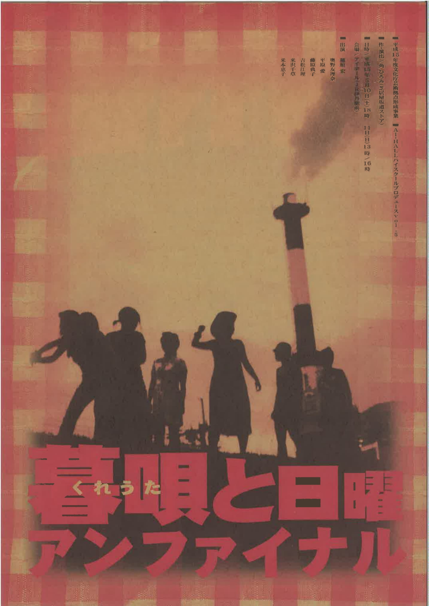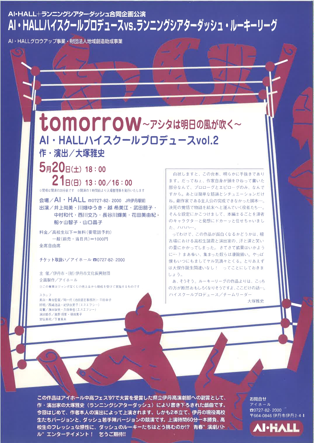 スタッフ/美術・舞台監督:岡一代(池田意匠事務所)、平田幸子 照明:西崎浩造紀伊由美子(エスエフシー) 音響:濱田留美、久保亜也(エスエフシー) 演出助手:奥野将彰、得田晃子 宣伝美術:下東英夫 協力:ランニングシアターダッシュ主催:伊丹市、(財)伊丹市文化振興財団 企画・製作:AI・HALL 助成:芸術文化振興基金、財団法人地域創造(ジャンボ宝くじ助成事業)