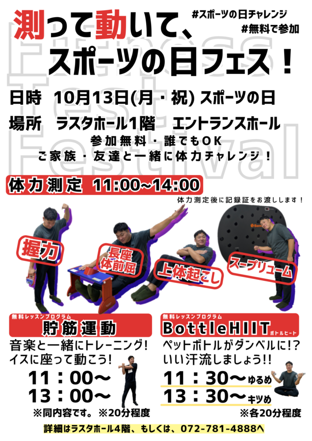 9月23日(火・祝)ラスタホールでは、フィットネスラスタ職員による