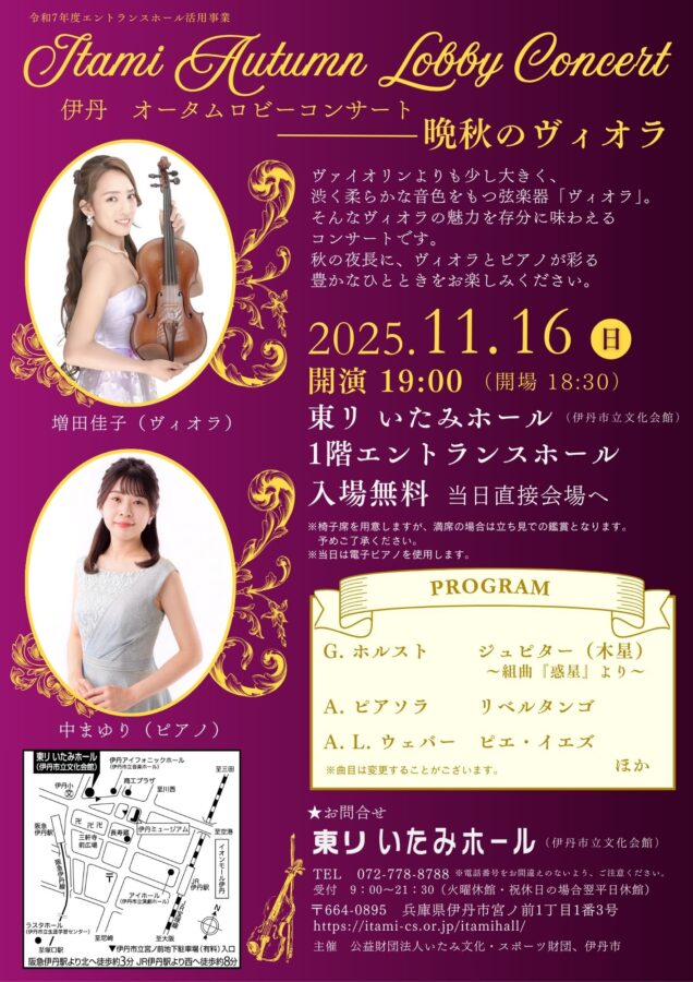 2025年11月16日(日)、令和7年度エントランスホール活用事業「伊丹 オータムロビーコンサート──晩秋のヴィオラ」を開催しました。