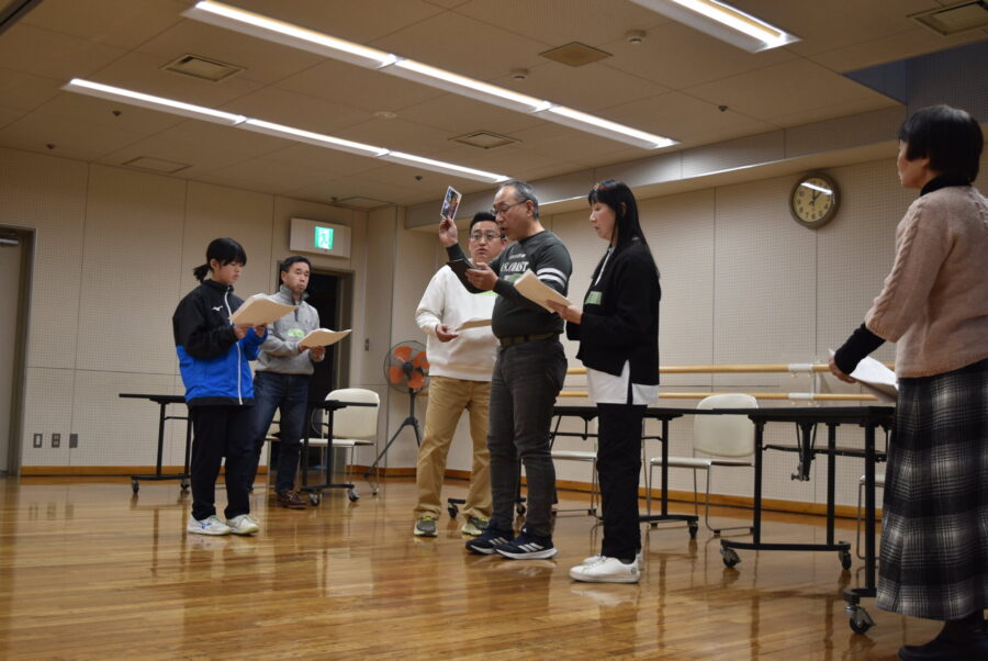 この台本の背景などのお話があった後、3グループに分かれて読んでもらいました。さっそく少し動きをつけて演じてみることに。