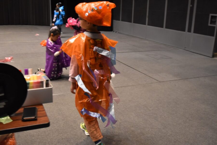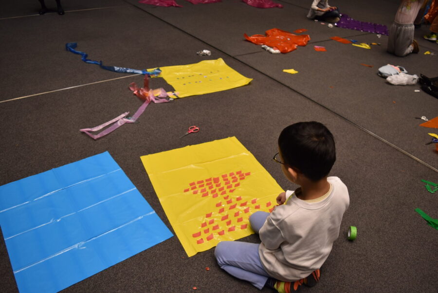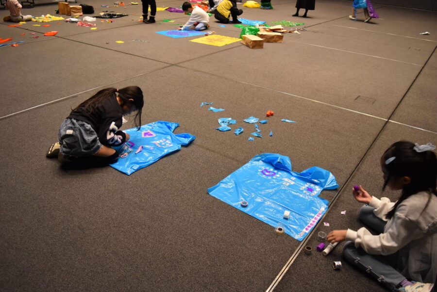 材料はカラービニール袋や紙袋、マスキングテープやキラキラシール。