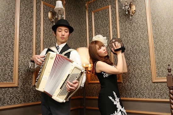 世界的にも珍しい、コンサーティーナとクロマチックアコーディオンという、大小二台の蛇腹楽器を手に、多くの国内のフェスやイベントに出演している異色デュオ。