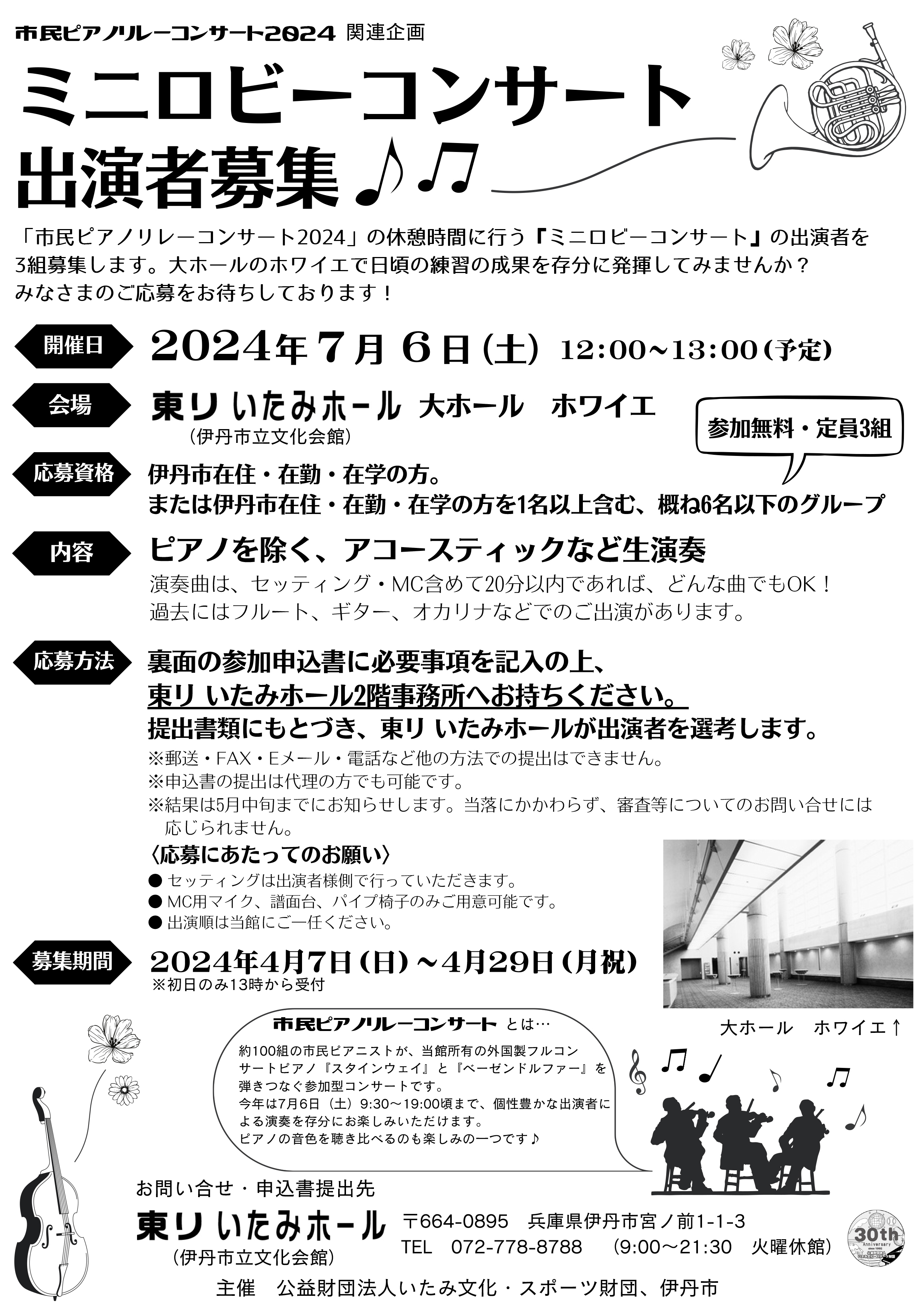 「市民ピアノリレーコンサート2024」の休憩時間に行う『ミニロビーコンサート』の出演者を3組募集します。大ホールのホワイエで日頃の練習の成果を存分に発揮してみませんか?